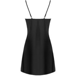 Un conjunto de lencería excepcionalmente hermoso hecho de satén negro brillante, una bata de baño con camisola que llega hasta la mitad del muslo. La parte delantera y las mangas largas de la bata, atadas a la cintura con un cinturón, están decoradas con un bonito encaje. Camiseta de tirantes finos ajustables, decorada con el mismo encaje en el busto. Tanga incluida