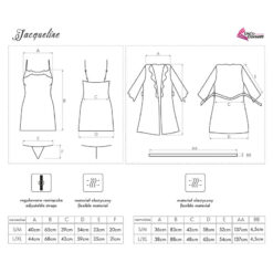 Un conjunto de ropa interior excepcionalmente hermoso hecho de satén violeta brillante, una bata de baño con una camisola que llega hasta la mitad del muslo. La parte delantera y las mangas largas de la bata, atadas a la cintura con un cinturón, están decoradas con un bonito encaje. Camiseta de tirantes finos ajustables, decorada con el mismo encaje en el busto. Tanga incluida.