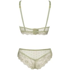 El conjunto de lencería es una obra de arte del encaje. El sujetador no está rígido y además está equipado con dos tirantes en el escote, por lo que seguramente llamará mucho la atención cuando se mire por debajo de una camisa o blusa. El sujetador sujeta bien el busto, lo que significa que las mujeres con senos más grandes también podrán usarlo. La ropa interior tentadora en color verde crudo también incluye braguitas de encaje cómodas y al mismo tiempo sensuales que, aunque son un poco más corpulentas, crean una atmósfera sexy. El diseño de las bragas resalta perfectamente los glúteos de las mujeres, haciendo que cada mujer se sienta especial. El conjunto es perfecto tanto para el día a día como para momentos un poco más especiales.