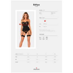 El sensual corsé Editya negro es una propuesta femenina y atractiva para el sexo. Las copas suaves y ligeramente translúcidas enfatizan perfectamente el busto, y los aros verticales dibujan bellamente la forma del cuerpo. Cómodo cierre a lo largo de toda la espalda que permite un ajuste perfecto y aporta estilo al conjunto.
