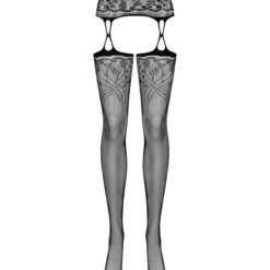 Medias en red fina de color negro bordadas estampado floral con liguero unido en una sola pieza fabricado y diseñado prestigiosa marca Obsessive